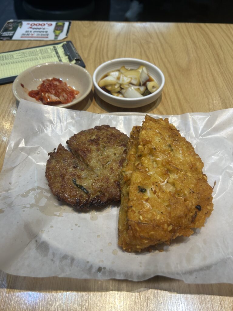 これはトンデムン市場のところの店のチヂミです。緑豆チヂミと豚チヂミを食べましたが、脂っぽく結構頑張って食べました。
